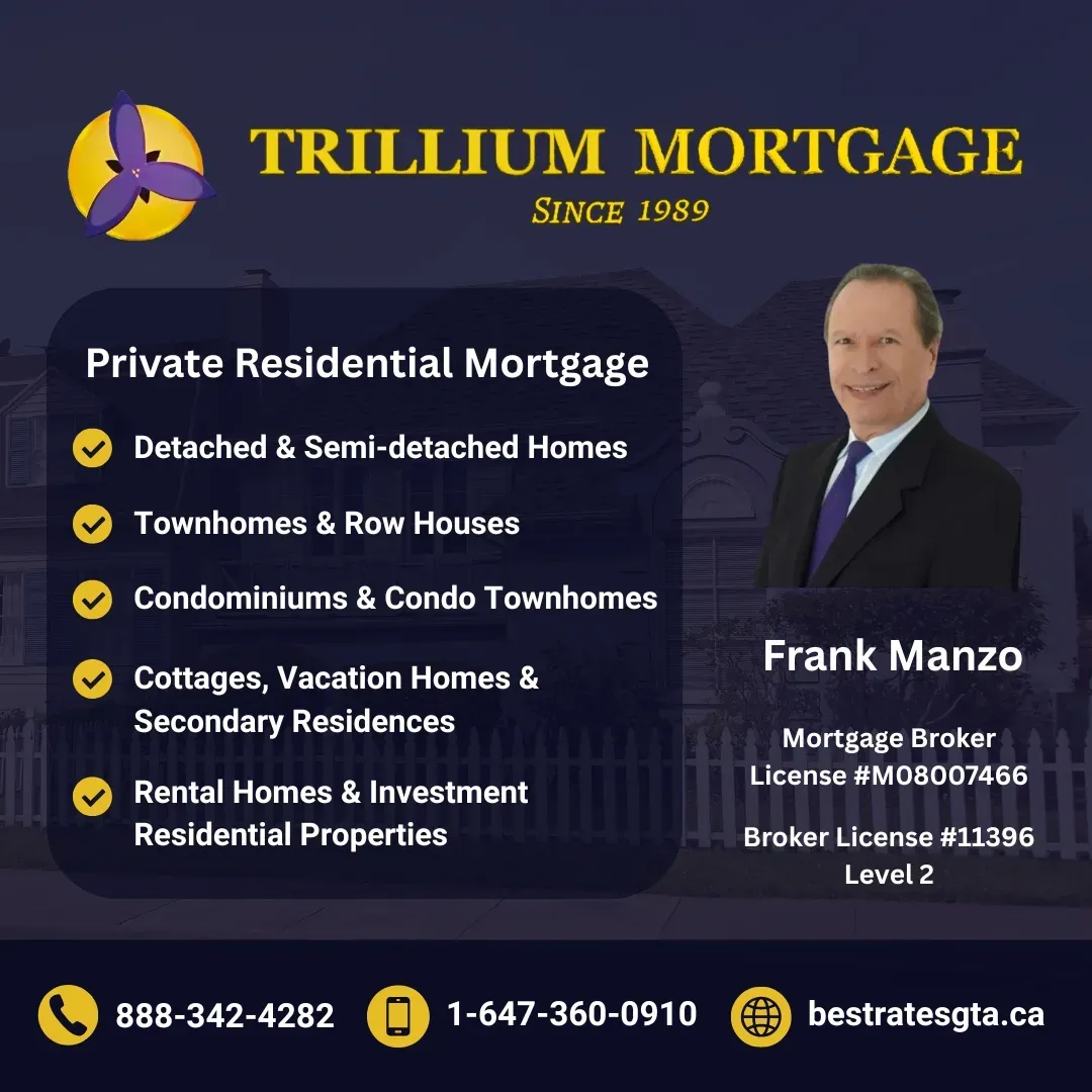 Founded in 1989 by Frank Manzo, Trillium Mortgage was established to support clients who do not fit traditional bank lending models. As a licensed Ontario Mortgage Broker, Frank built the firm around flexible underwriting, equity-based solutions, and practical financing options for homeowners, business owners, and property investors.
