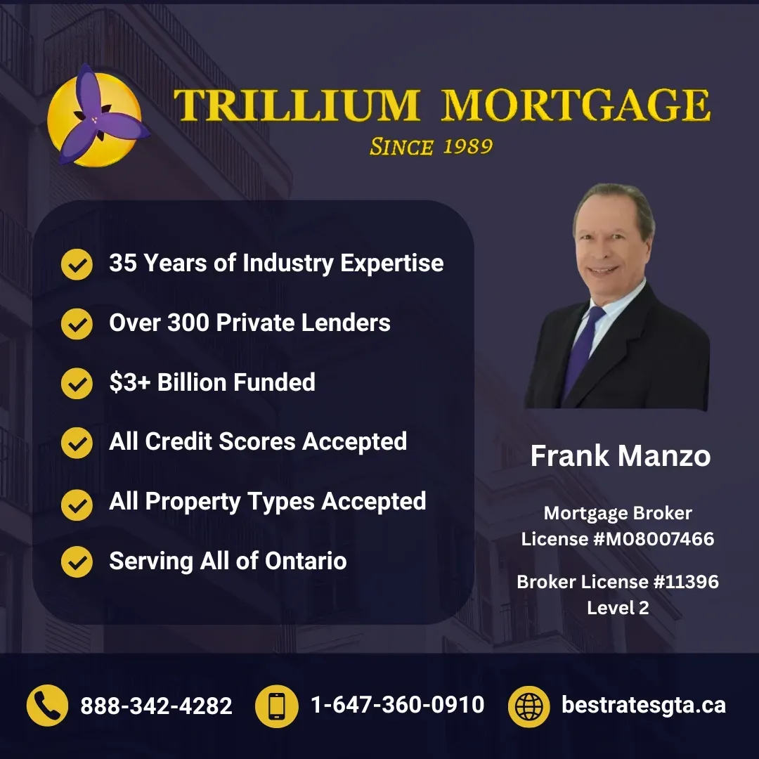 Founded in 1989 by Frank Manzo, Trillium Mortgage was established to support clients who do not fit traditional bank lending models. As a licensed Ontario Mortgage Broker, Frank built the firm around flexible underwriting, equity-based solutions, and practical financing options for homeowners, business owners, and property investors.