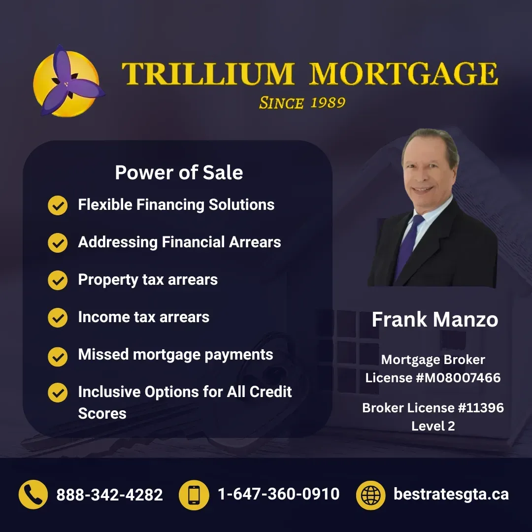 Founded in 1989 by Frank Manzo, Trillium Mortgage was established to support clients who do not fit traditional bank lending models. As a licensed Ontario Mortgage Broker, Frank built the firm around flexible underwriting, equity-based solutions, and practical financing options for homeowners, business owners, and property investors.